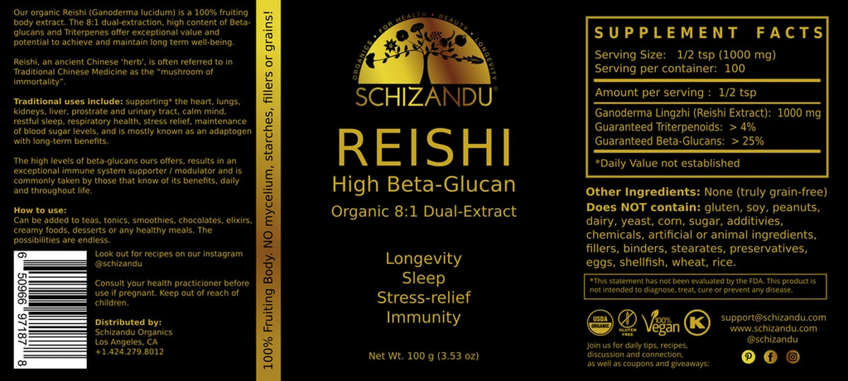 Our organic Reishi (Ganoderma lucid) is a 100% fruiting body extract.